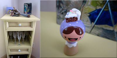 just one more thing to a setup I have going. Like the above sideboard. It looks perfectly fine with just the dancing couple and vase. But I so want to fill up the entire surface with some kind of arrangement. That can work, too, but sometimes simplicity is the way to go. Here are several surfaces in my present living situation where I have resisted the urge to overdecorate. It's looking more adult. You have to keep that in check. It's okay to have feminine things and artistic things, but let's be a big girl, too. It's about balance, ya know. I can really get carried away with non-relevant
